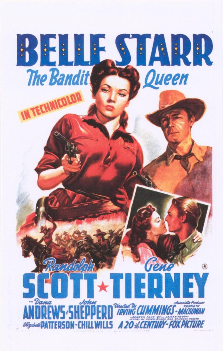 DescriptionReproduction movie poster, "Belle Starr, The Bandit Queen" starring Gene Tierney and Randolph Scott.The setting is the Civil War and its aftermath. Belle's family has lost their land to Yankees. She marries Confederate guerilla leader Sam Starr and they continue activities against exploiters until she is shot riding to alert Sam to a trap. Highly romanticized and little connection with history.