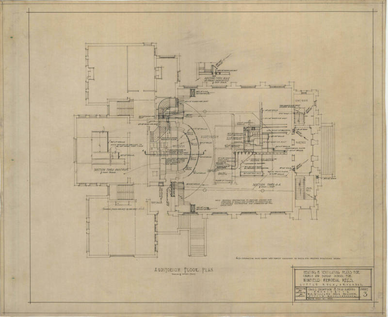 DescriptionCharles Thompson architectural drawing for Winfield Memorial M.E. Church at 1601 Louisiana in Little Rock, Arkansas. Auditorium floor plan.Status
