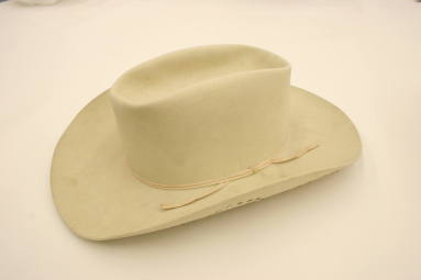 The fabric is brown polyester accented with white leather. Spur-shaped leather has been sewn into the collar, shoulders, cuffs of the shirt, and towards the bottom of the shorts. White leather fringe detail has been applied to the chest, along the arms, and the bottom of the shorts. The fringe is studded with clear rhinestones. A white leather rhinestone studded hat band (returned to Davis 6/17/13) accompanies the outfit. Terrie Davis would have worn the Nudie Suit during appearances associated with her mother, Gail Davis, star of the television series "Annie Oakley".
