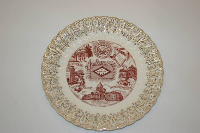 DescriptionA souvenir plate featuring images of famous Arkansas buildings and historic sites, including the Old State House Museum. The plate is white with ornate gold designs around the edges. The images in the middle are all in red. An image of the Arkansas state flag is in the middle of the plate with "Arkansas" above it in a red font. The state seal is above it. Aside from the Old State House, images of War Memorial Stadium, Lake Norfolk and Dam, Central Avenue in Hot Springs, Blanchard Springs in the Ozarks, and the Arkansas State Capitol building are also featured.