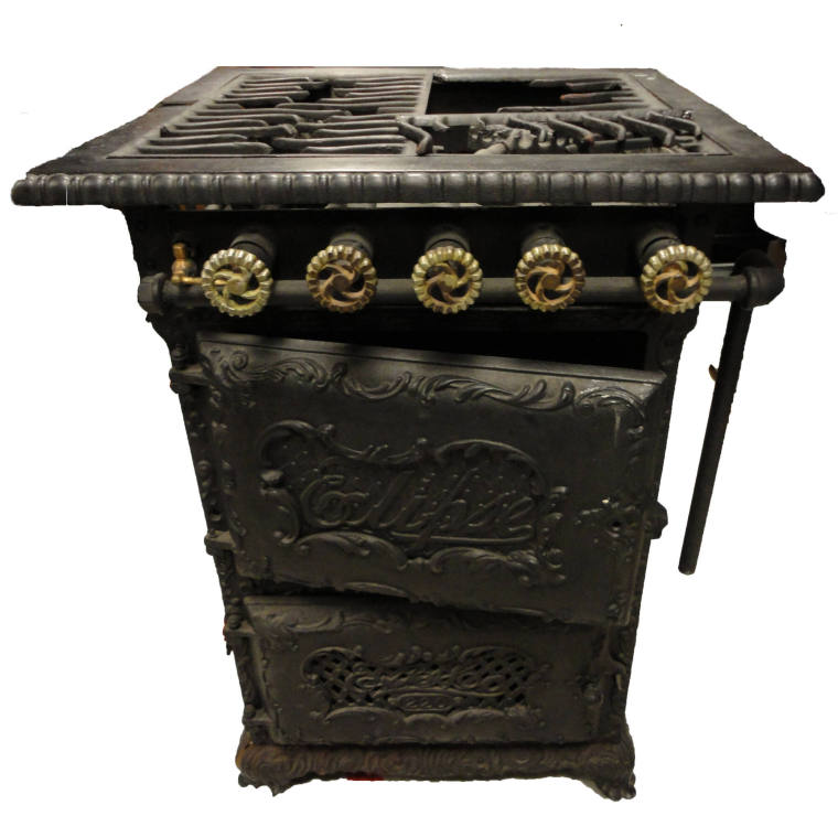 DescriptionEclipse gas stove - model 220 with oven above and broiler below. Four burners with oven above and broiler below. Detachable shelves. Cast iron with extensive ornamentation. Separate door for oven and broiler. Name, model and manufacture cast into front as part of decoration.