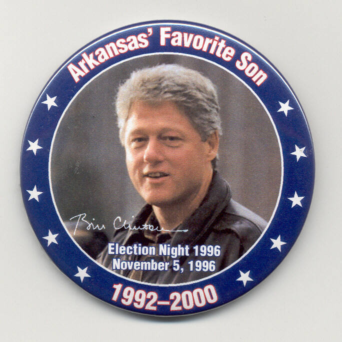 DescriptionOne of eight buttons from the 11/5/1996 election night of President Bill Clinton manufactured by United Cerebral Palsy. This button shows President Clinton in a leather jacket and reads, "Arkansas' Favorite Son."
