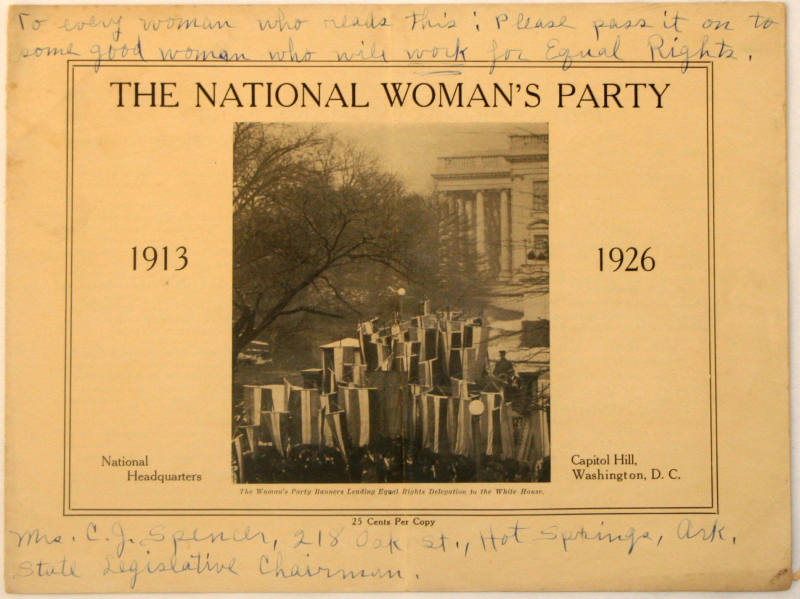 DescriptionNational Woman's Party Publication. Booklet distributed by NWP containing pictures and info about the NWP and their accomplishments. Handwritten in blue ink across the top and bottom borders of cover: "To every woman who reads this: Please pass it on to some good woman who will work for equal rights. Mrs. C.J. Spencer, 218 Oak St., Hot Springs, Ark., State Legislative Chairman"