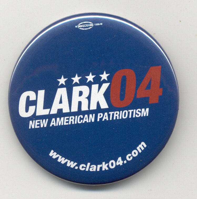 DescriptionCampaign button for Wesley Clark. Button is navy blue with "Clark" written in white block letters and "04" in red. Also written below the name is the slogan "New American Patriotism". Four white stars are above the name and printed along the bottom is "www.clark04.com". Button has standard clasp pin on the back.